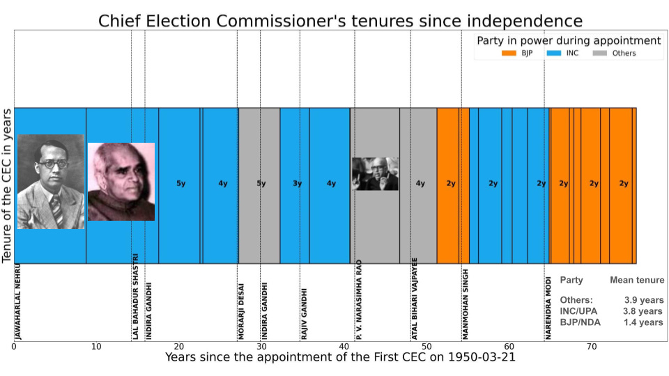 The Supreme Court observed that the appointment of a CEC for a tenure less than of 6 years is a clear breach of law. We can see that there were only 3/25 CECs so far had a tenure of more than 6 years. These are Sukumar Sen, the first CEC who conducted the first general elections in India; Kalyan Sundaram, the second CEC; T.N.Seshan, the 10th CEC who cleaned the Indian electoral system by implementing the Voter ID system. Even in the recent judgement, SC cited the role played by Seshan as an impartial CEC.